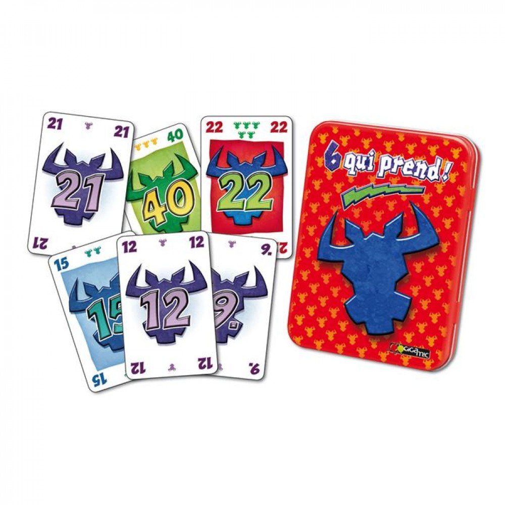 6 qui prend ! est désormais un incontournable jeu de cartes de la gamme Gigamic. Il s'agit du jeu idéal à jouer en famille ou entre adultes. Le principe est simple, celui qui pose la 6ème carte de la ligne récupère toutes les cartes.