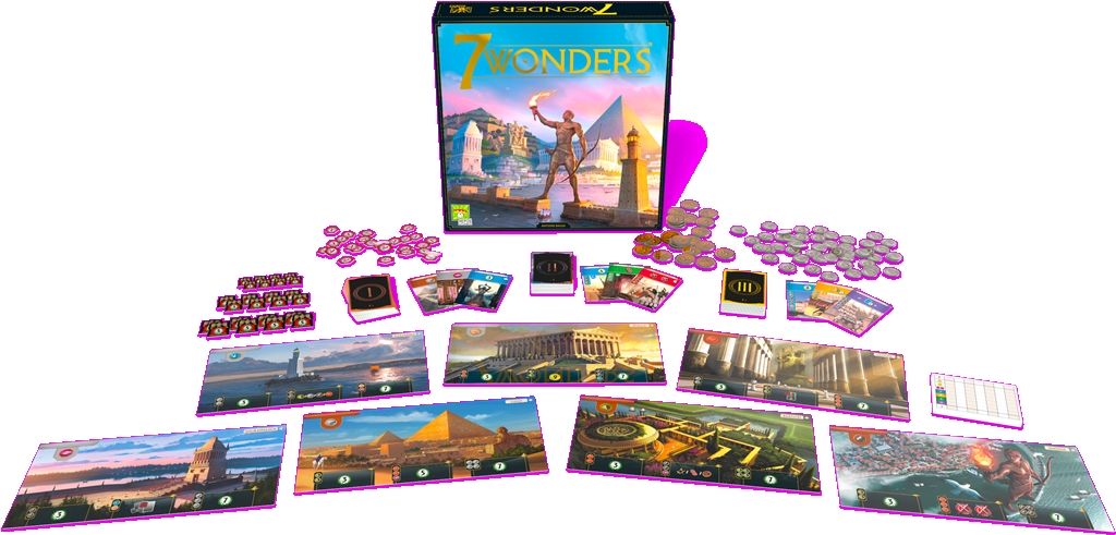 7 Wonders est un jeu de stratégie pour 3 à 7 joueurs avec une variante « expert » pour 2 joueurs.