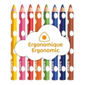 Cette pochette contient 8 crayons triangulaires, courts et épais, faciles à tenir pour les petites mains. Des couleurs vives apparaissent grâce aux mines tendres qui marquent bien.