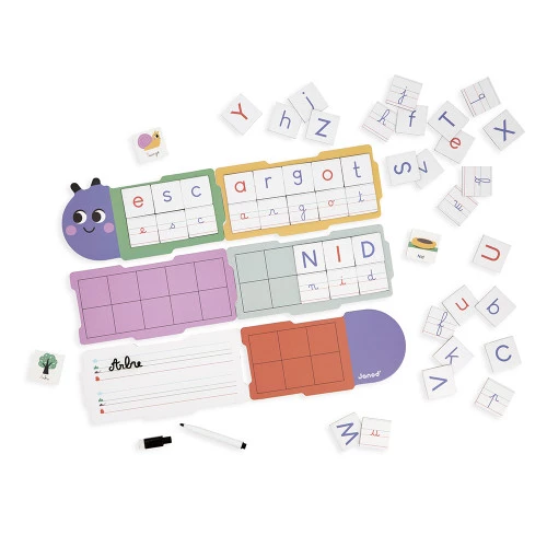 Petit à petit, votre enfant apprendra à reconnaître les lettres et à les reproduire. En assemblant les différentes planches, il pourra agrandir la chenille et disposer toujours plus de lettres. Il pourra ensuite écrire des mots simples, en s’aidant des cartes illustrées pour identifier la prononciation de chaque lettre. Accompagnés d’un adulte ou en toute autonomie, il pourra progresser à son rythme dans l’univers des graphèmes !