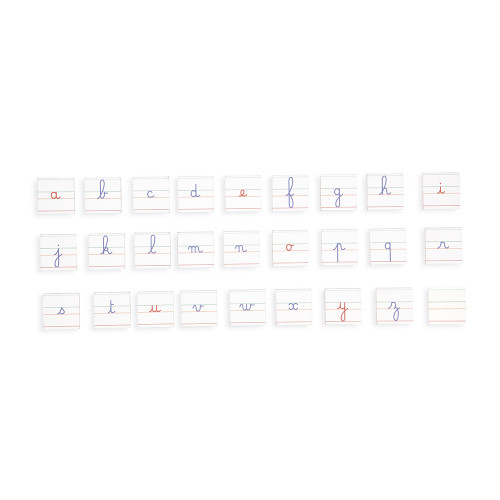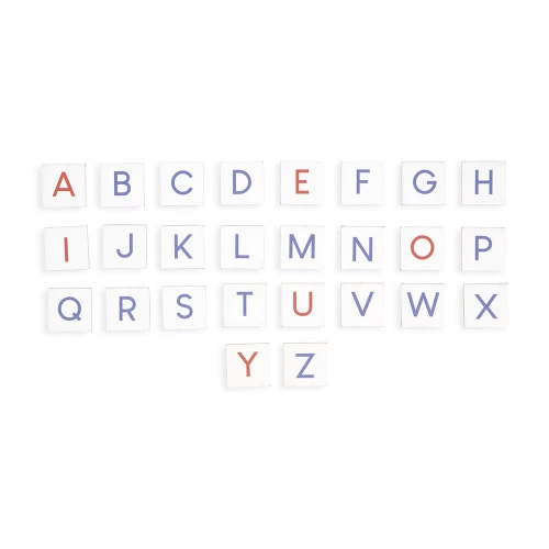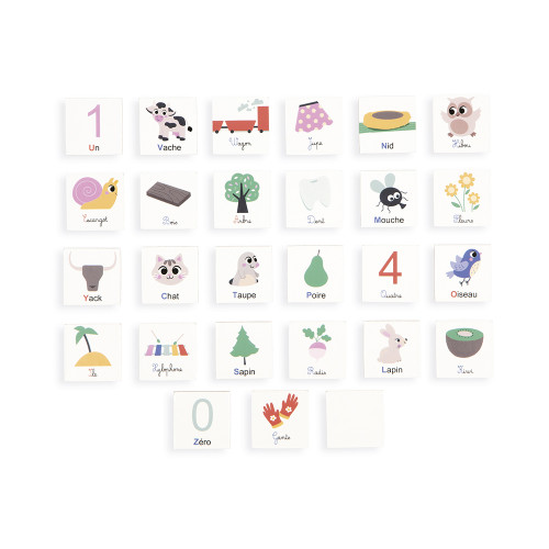 - Contenu : 6 planches (dont 1 avec surface effaçable au verso pour s’exercer), 1 feutre effaçable à sec, 78 lettres (chacune des 26 lettres de l’alphabet dans 3 types d’écriture) et 26 cartes modèles illustrées