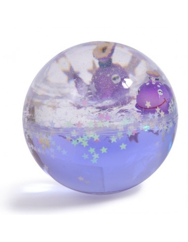 Une grosse balle rebondissante remplie de liquide coloré, où l'on voit deux baleines se baigner au milieu d'étoiles brillantes!