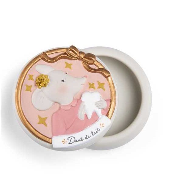 Découvrez la boite à dents de lait de la collection La petite école de danse de Moulin Roty, une boite à dents toute ronde en résine avec une souris en relief sur le couvercle.