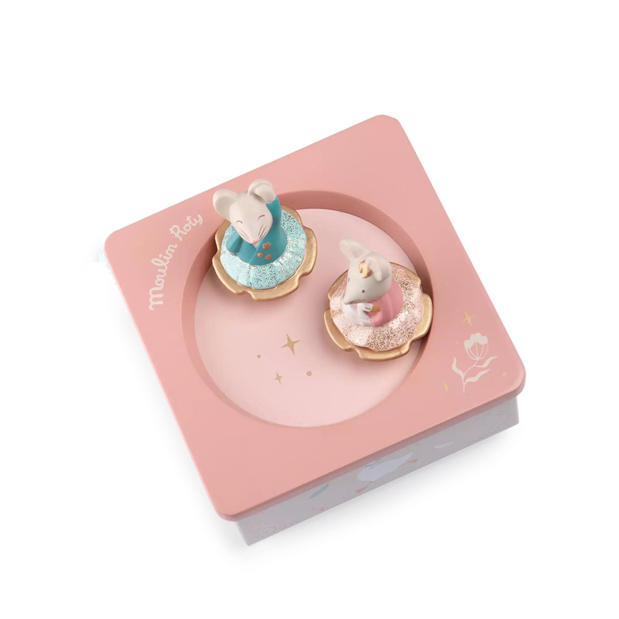 Une boite à musique illustrée où 2 petites souris dansent au son d'une douce mélodie pour bercer et endormir bébé. Les plus grands prendront plaisir à actionner eux-mêmes le mécanisme sous la boîte pour voir danser les figurines en résine.