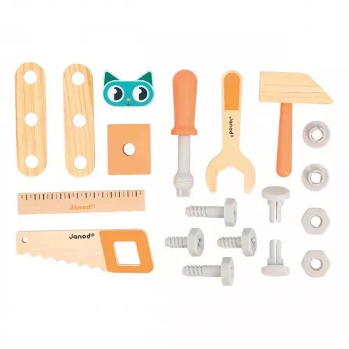 Avec ce camion de bricolage Brico'Kids, votre enfant pourra développer sa motricité fine et globale, tout en s'amusant ! Compagnon des premiers pas, ce jouet d'éveil en bois est équipé de roues en caoutchouc silencieuses. Véritable jeu de construction entre deux promenades, le camion de bricolage est livré avec une multitude d'accessoires et d'outils. Les vis sont crantées pour encore mieux imiter les vraies et permettre une utilisation facile pour votre petit bricoleur. Enfoncer les clous, visser, mesurer…tant de manipulations permettant de stimuler sa dextérité en bricolant comme un grand ! La benne basculante est un autre atout de ce camion.