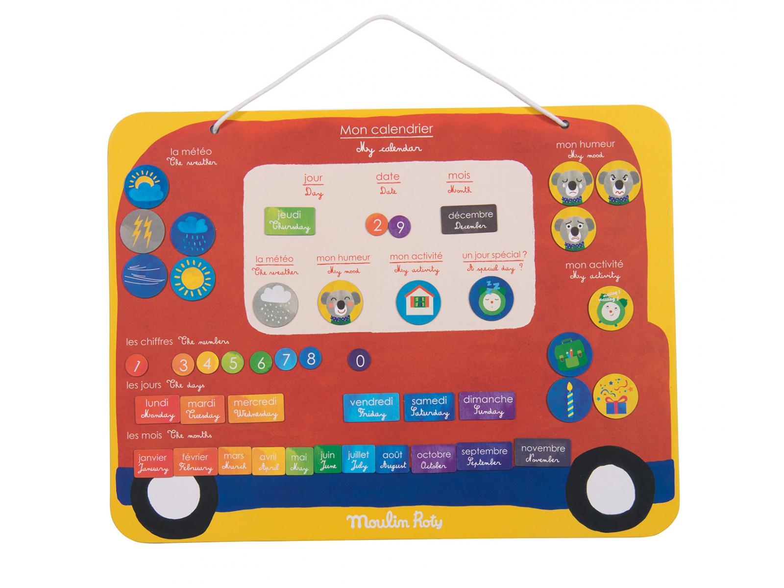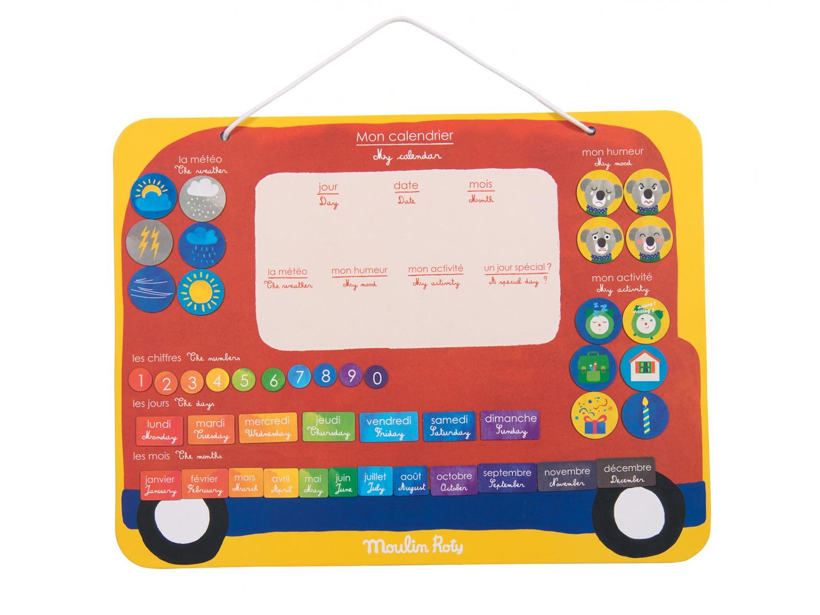 Un calendrier magnétique très complet comprenant 45 magnets et pouvant s'accrocher au mur. Tu pourras y afficher le mois de l'année, le jour de la semaine, la date du jour, la météo, tes activités et même ton humeur du jour!