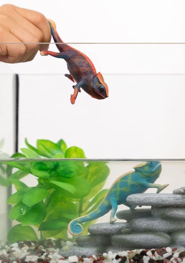 Le caméléon peut non seulement prendre une apparence trompeuse, mais aussi changer de couleur. Selon la température, il est plutôt vert-turquoise ou brun-rouge. C'est souvent pour impressionner la femelle que le mâle change de couleur.
