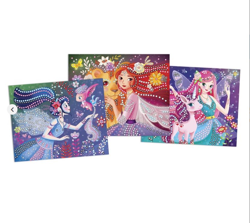 À l'aide du code couleur, votre enfant pourra décorer et faire scintiller trois jolies cartes en y ajoutant de nombreux diamants. Une fois terminées, il pourra les offrir ou les exposer sur le chevalet fourni.