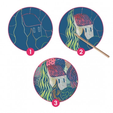 Petit à petit, à l'aide de l'outil inclus, l'artiste en herbe s'amusera à gratter la surface des quatre cartes afin d'en dévoiler les illustrations.