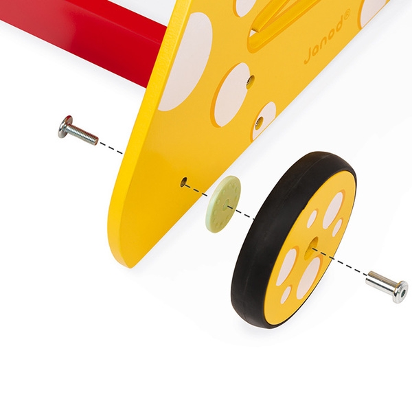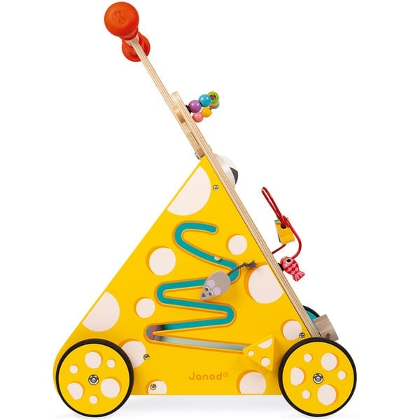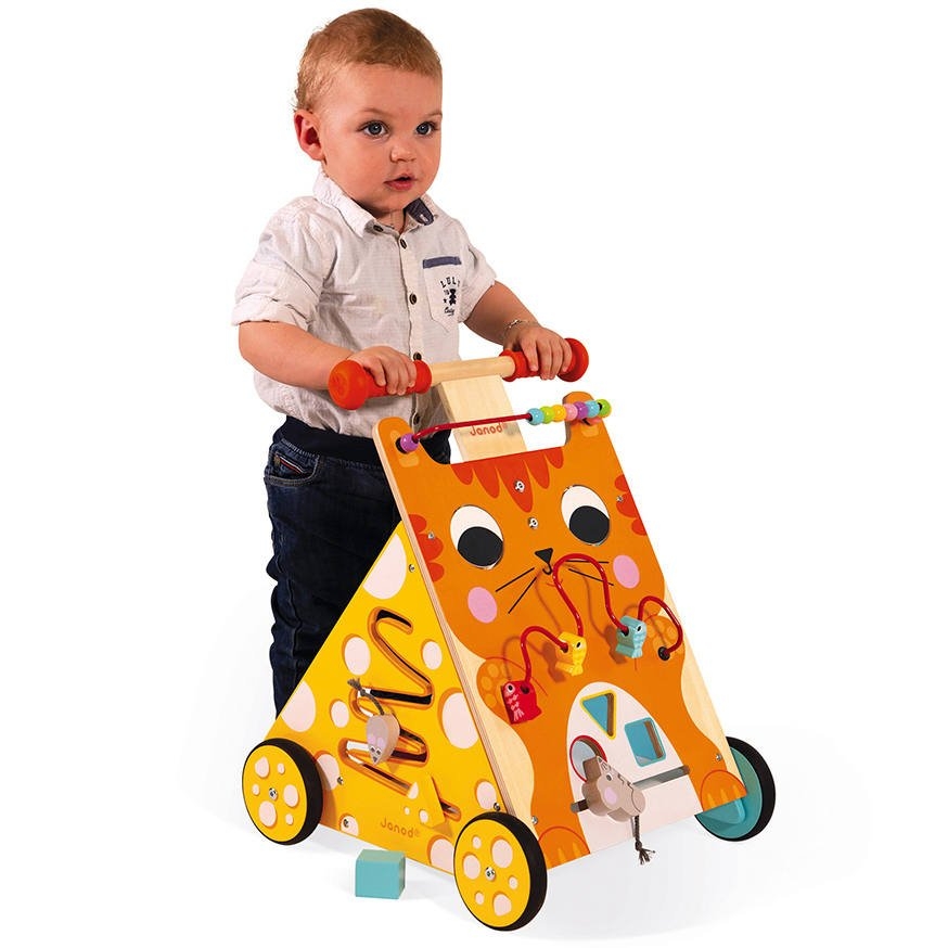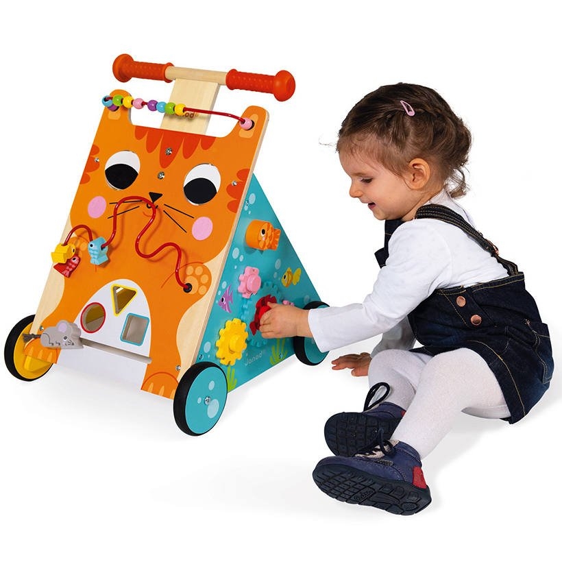 Janod vous propose la combinaison parfaite entre un chariot de marche et un tableau d'activités !