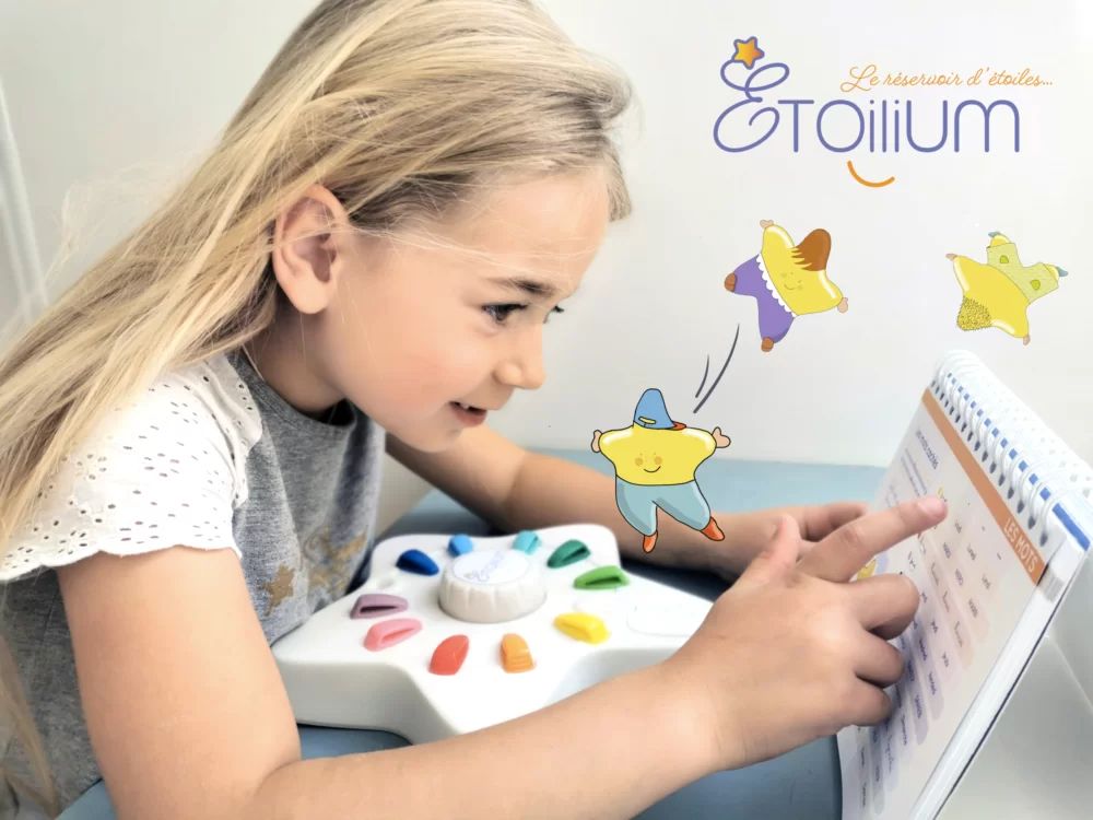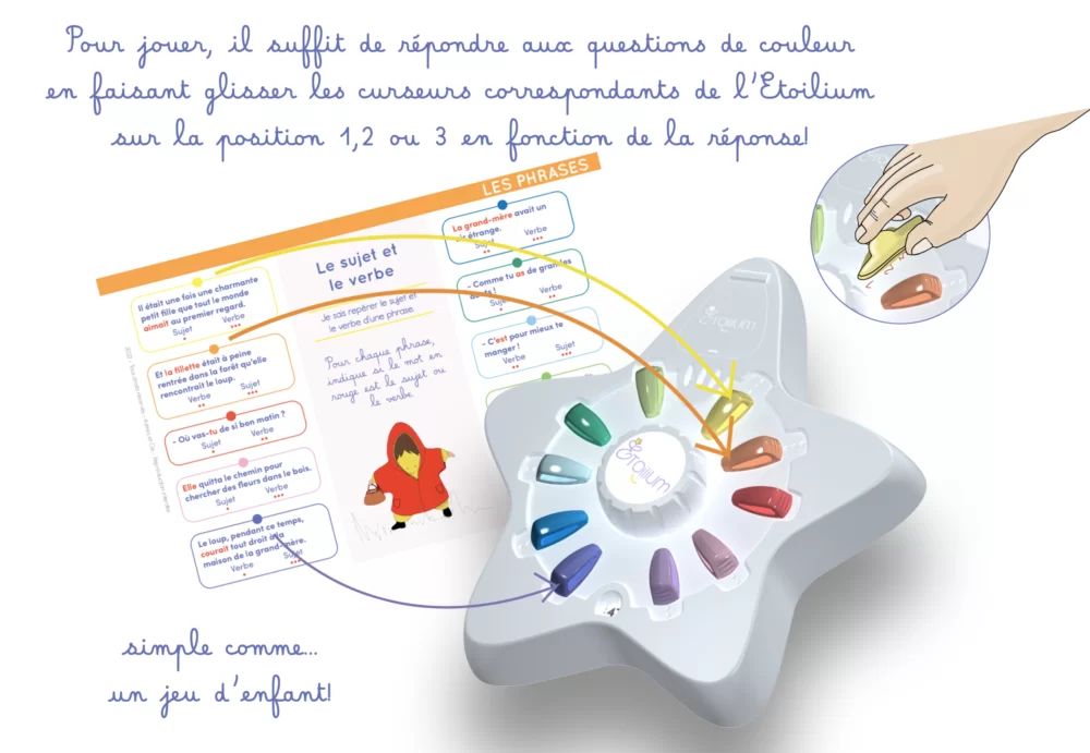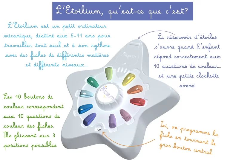 L'Etoilium est un jeu pédagogique complétement magique et entièrement mécanique, sans pile, sans onde et sans écran conçu pour les enfants de la 3e maternelle à la 5e primaire.