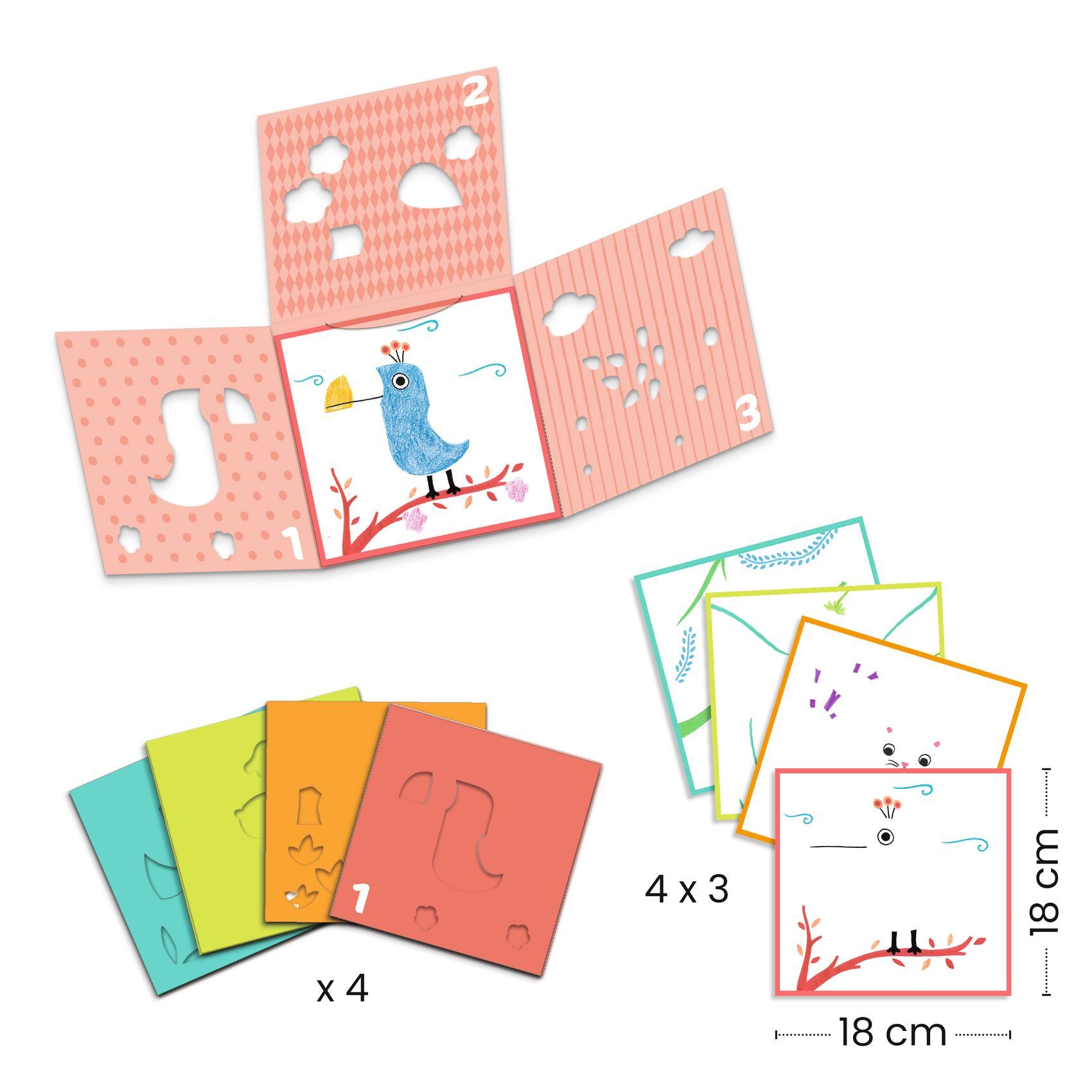 Contenu : 4 pochoirs à 3 rabats, 12 feuilles imprimées à glisser dans le pochoir