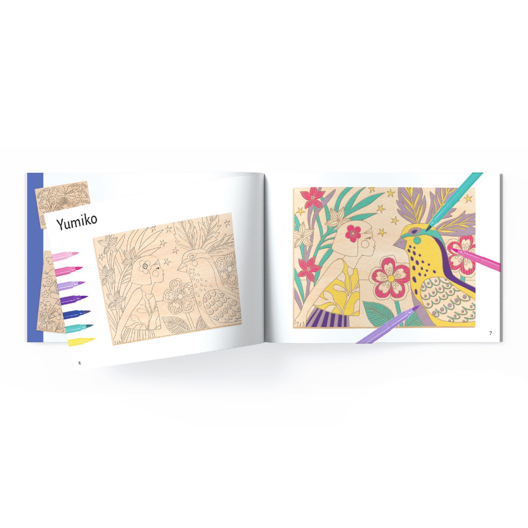 Contenu : 3 planches de bois laserisées de tailles différentes, 7 feutres pinceaux double pointe, 1 planche de papier buvard, 1 livret explicatif détaillant l'activité pas-à-pas