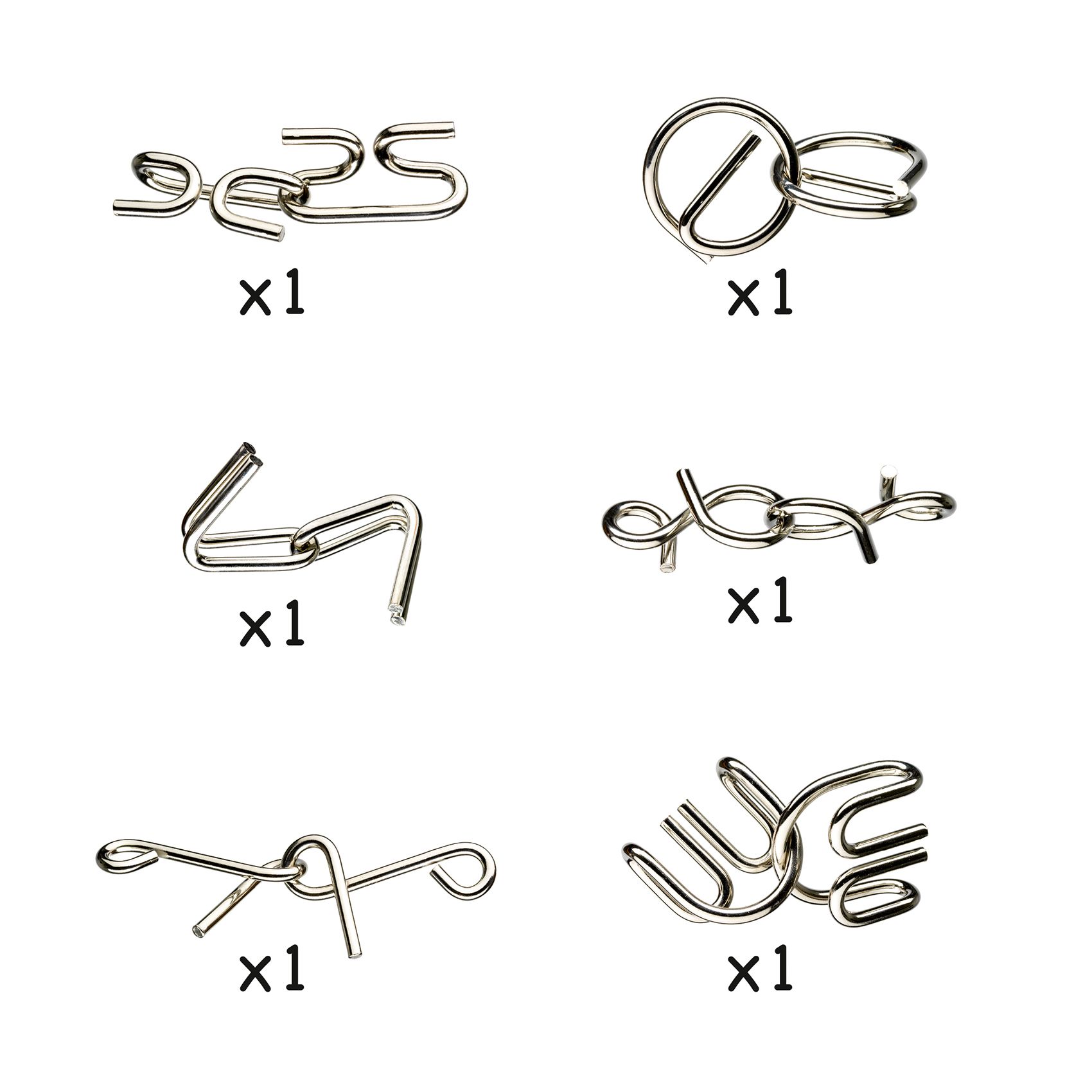 Cette boite contient 6 beaux casse-tête en métal pour mettre à rude épreuve les neurones !
