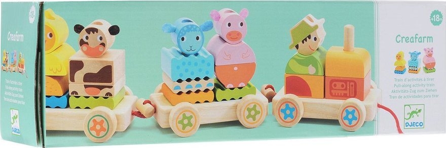 Creafarm est un train d'activités à tirer de la marque Djeco. Il composé de 24 pièces en bois aux couleurs vives que votre enfant pourra assembler et empiler à volonté. Il pourra imaginer, construire, reproduire les animaux de la ferme ou encore inventer des animaux rigolos!