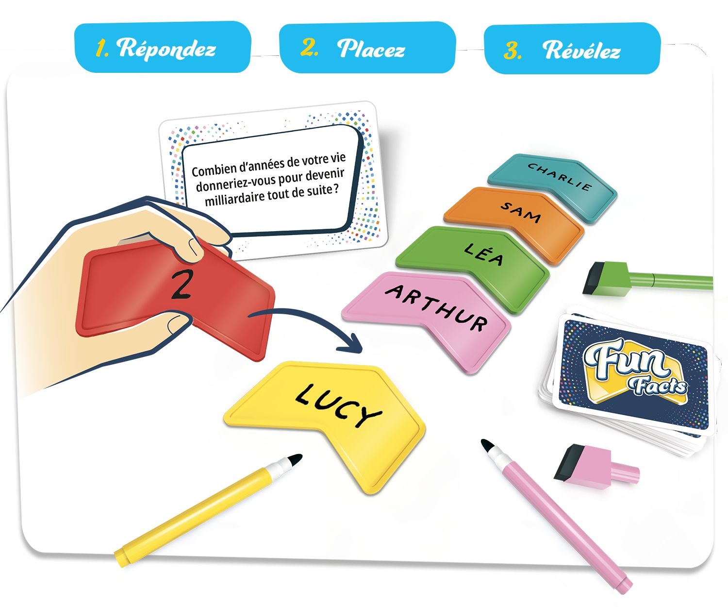 Fun Facts est le nouveau jeu d'ambiance coopératif de Repos Production ! Après Just One et So Clover, voici un nouveau party game rapide et bienveillant, idéal pour l'apéro ! Vous allez vous découvrir les uns les autres, en répondant à des questions qui partent dans tous les sens.