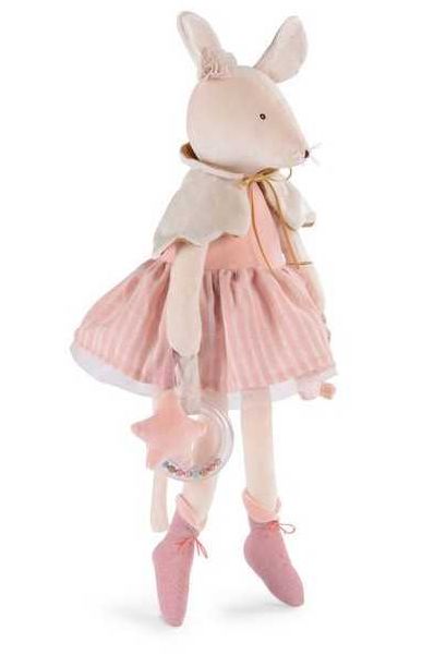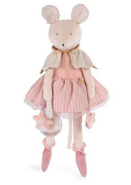 Découvrez la grande souris d'activités de la collection La petite école de danse de Moulin Roty, un grand jouet d'éveil en tissu poétique de 57 cm pour éveiller bébé dès ses premiers mois.