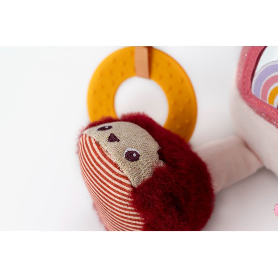 Un jeu multi-sensoriel : bruit de papier, miroir, anneaux, hochet, anneau de dentition... Il est facile à saisir grâce à ses nombreuses accroches.