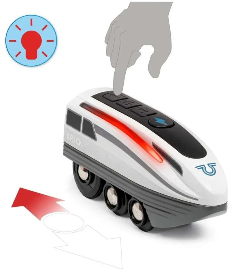 Ce train en bois est le plus rapide du BRIO World ! Pour aller deux fois plus vite, appuyez sur le gros bouton turbo de la locomotive BRIO ! La poussée turbo dure 5 secondes et, tandis que le train va à toute vitesse, les lumières blanches sur les côtés de la locomotive deviennent bleu.