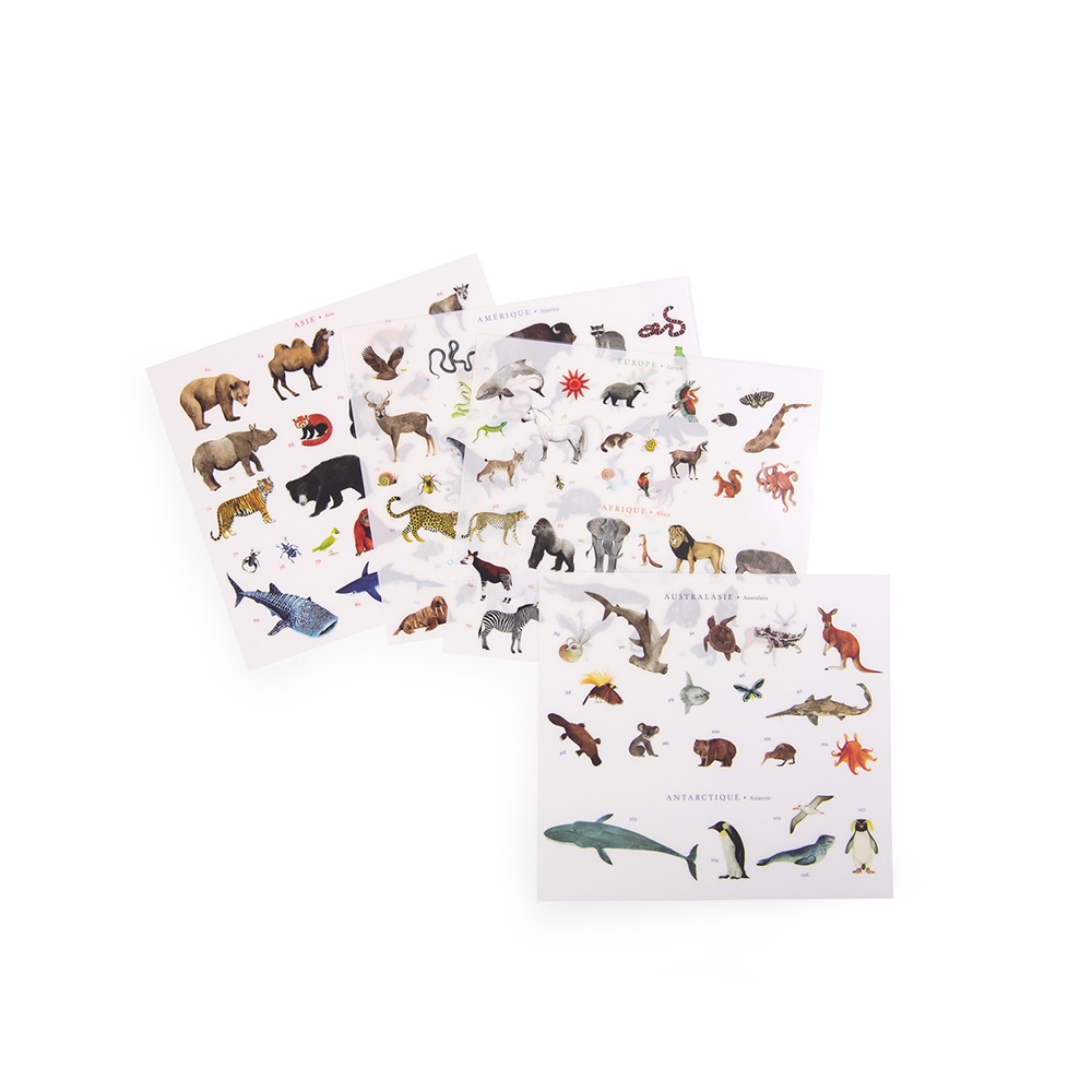 Utilisez les 4 planches de décalcomanies et le poster pour replacer les 107 animaux dans leur habitat naturel sur la carte du monde. Ce jeu éducatif favorise l'apprentissage des noms des animaux et des continents. Une fois les décalcomanies correctement positionnées, utilisez un crayon pour frotter délicatement sur chaque animal. Votre enfant sera émerveillé de voir l'animal apparaître comme par magie sur la carte !