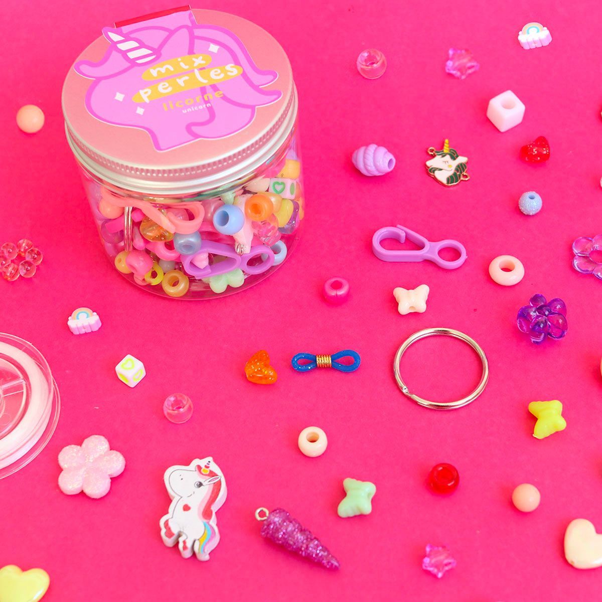 - Contenu : une bobine de fil élastique de 10 mètres, mix de perles licorne, divers accessoires (cordon à lunettes, fermoir mousqueton...)