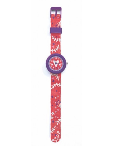 Son cadran violet illustré d'un joli cœur et son bracelet rouge joliment décoré de motifs plairont à coup sûr à votre petite tête blonde.
