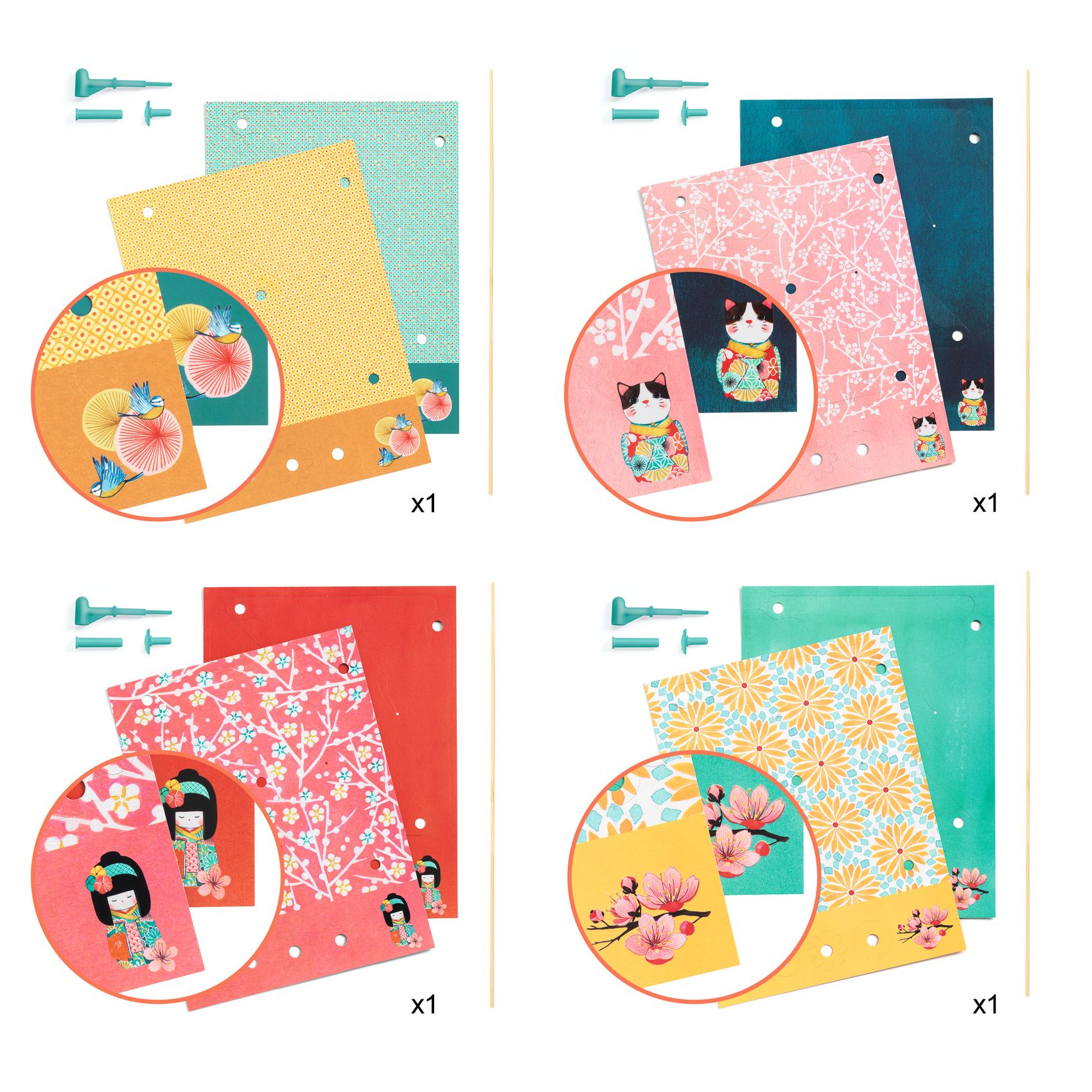 Contenu : 4 bâtons en bois, 4 attaches, 8 feuilles solides et colorées et 1 livret explicatif pas à pas