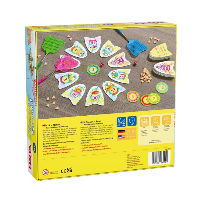 Comment jouer : Tout d’abord, lancez une question de multiplication : combien font 5 fois 8 ? Il est maintenant temps de faire le calcul rapidement et de trouver la mouche avec le bon résultat ! Celui qui applaudit en premier ramasse des mouches en bois et se rapproche de la victoire.