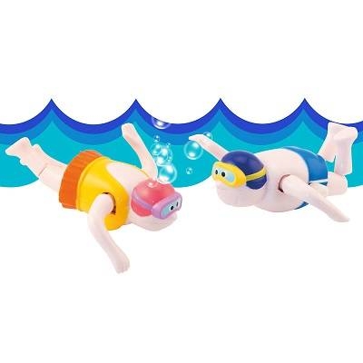 Nageuse en plastique à remonter. Maillot de bain chic à volants, lunettes de piscine, bonnet de bain, on remonte la molette, on pose la nageuse dans un lavabo, une baignoire ou une bassine et c'est parti ! Elle se transforme en nageuse olympique !