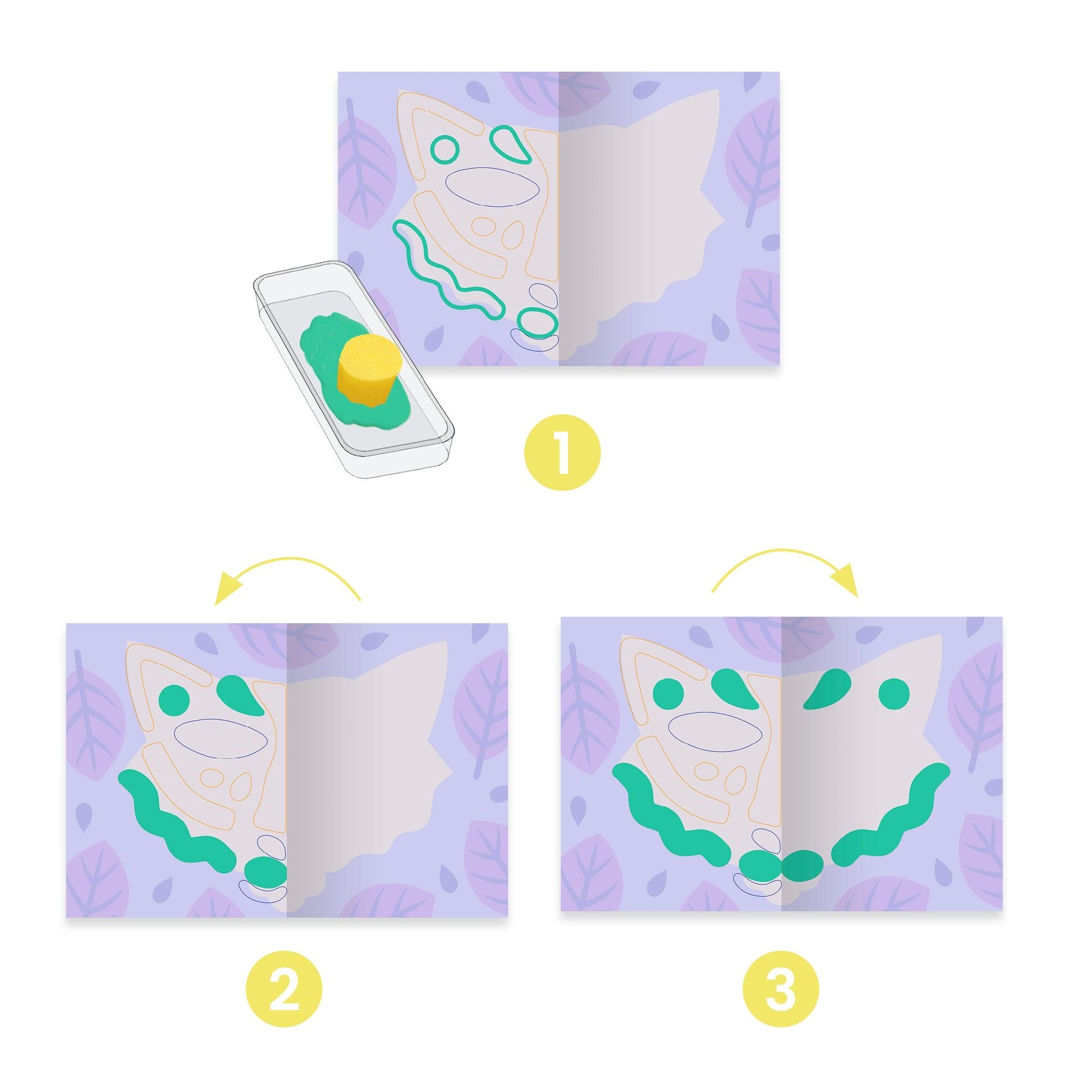 L'enfant dépose la peinture d'un côté, puis il replie la feuille. Il appuie et lorsqu'il ouvre la feuille : surprise, l'animal entier apparaît tout en en peinture ! Une fois la peinture sèche, il décore ensuite sa feuille avec les stickers.