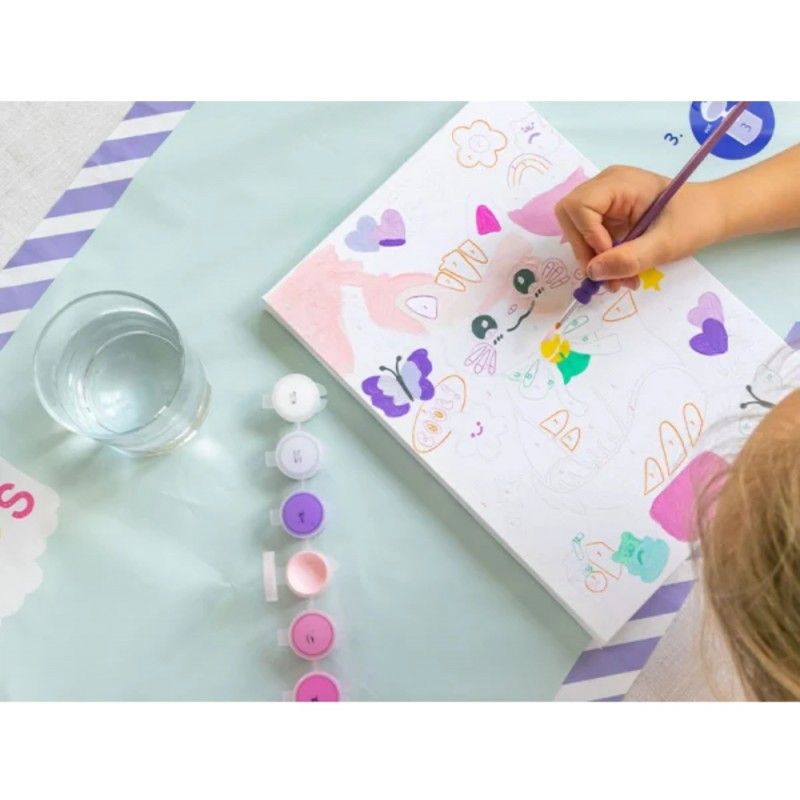 - Contenu : 1 pinceau ergonomique, 11 godets de peintures à l'eau refermables, une nappe adhésive de protection, une toile 18 x 25 cm à peindre
