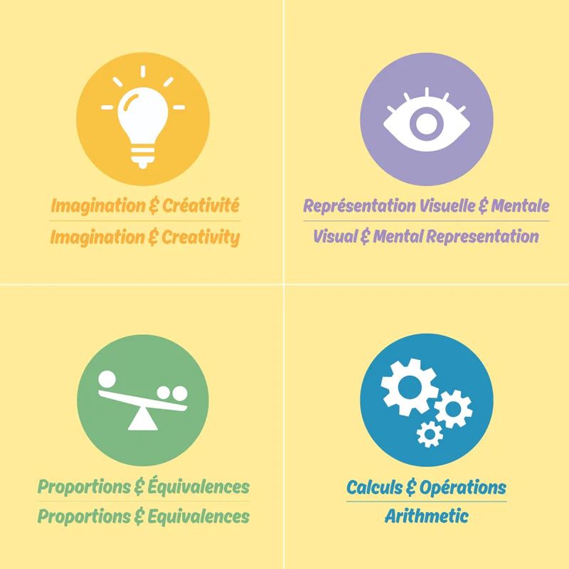 4 angles travaillés : imagination et créativité, représentation visuelle et mentale, proportions et équivalences, calculs et opérations