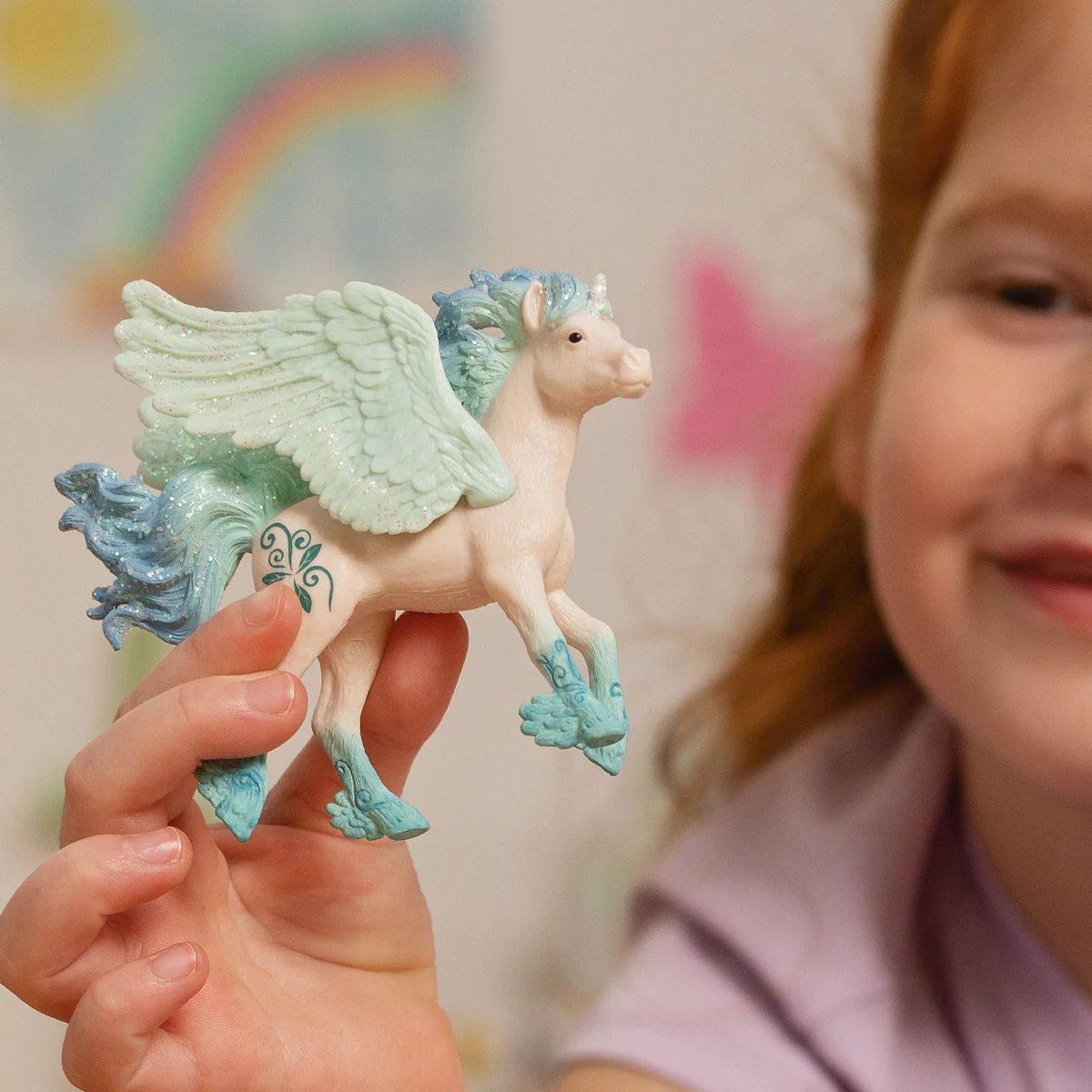 Vous pouvez dire que le poulain de la licorne Stormy est un tourbillon fougueux : sa crinière bleu turquoise et son épaisse queue scintillante ont été secouées par le vent. Il déploie ses grandes ailes bleu clair. Son pelage brillant est orné d'un joli tatouage en forme de vigne verte.