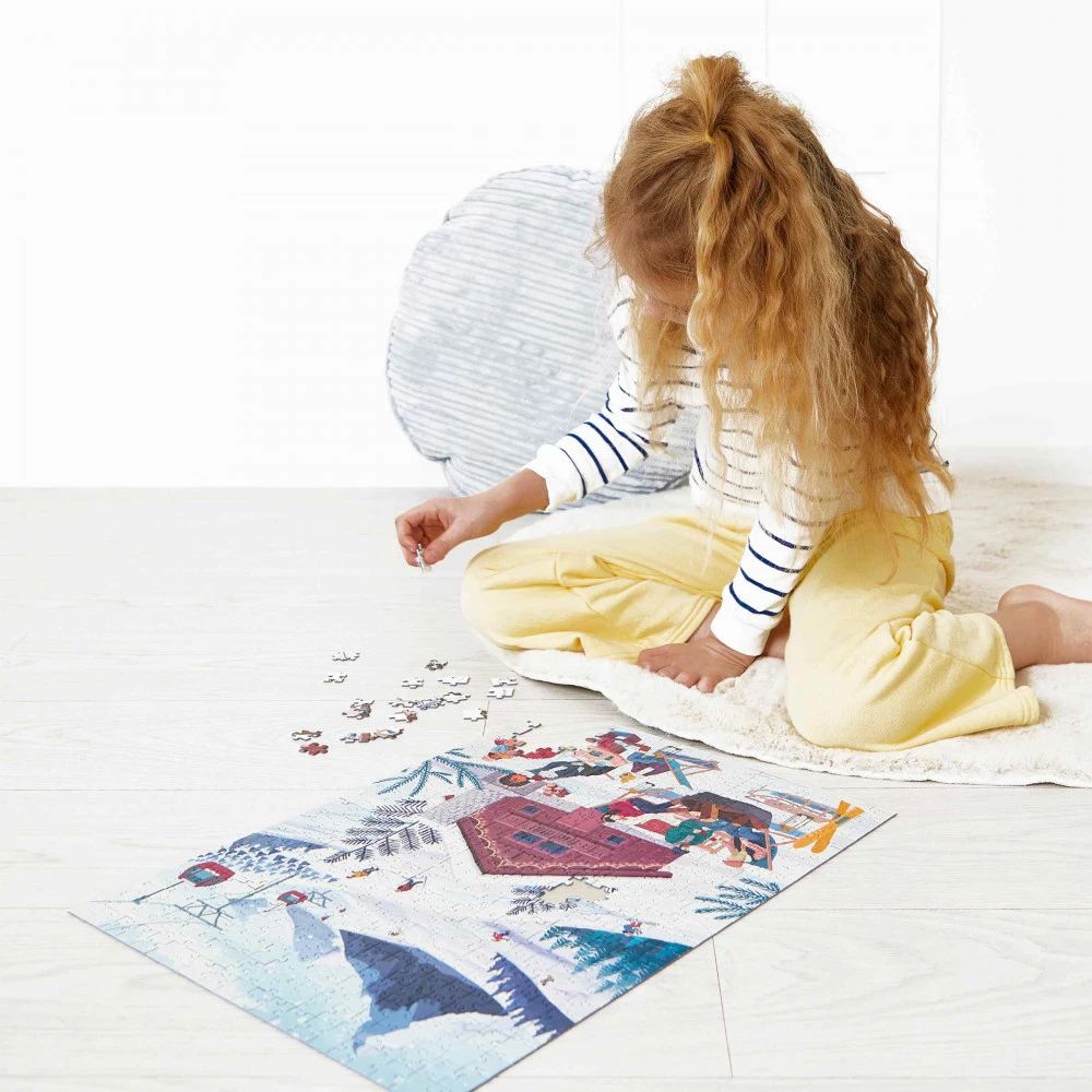 Ce puzzle de 500 pièces fait la part belle à tous les incontournables d'un après-ski réussi : une bonne fondue au fromage, un chocolat chaud au coin du feu, une couverture confortable, des amis … Et une vue à couper le souffle sur les montagnes enneigées ! Le grand nombre et la taille des pièces font de ce puzzle un vrai challenge où minutie et logique seront indispensables pour reproduire la jolie illustration.