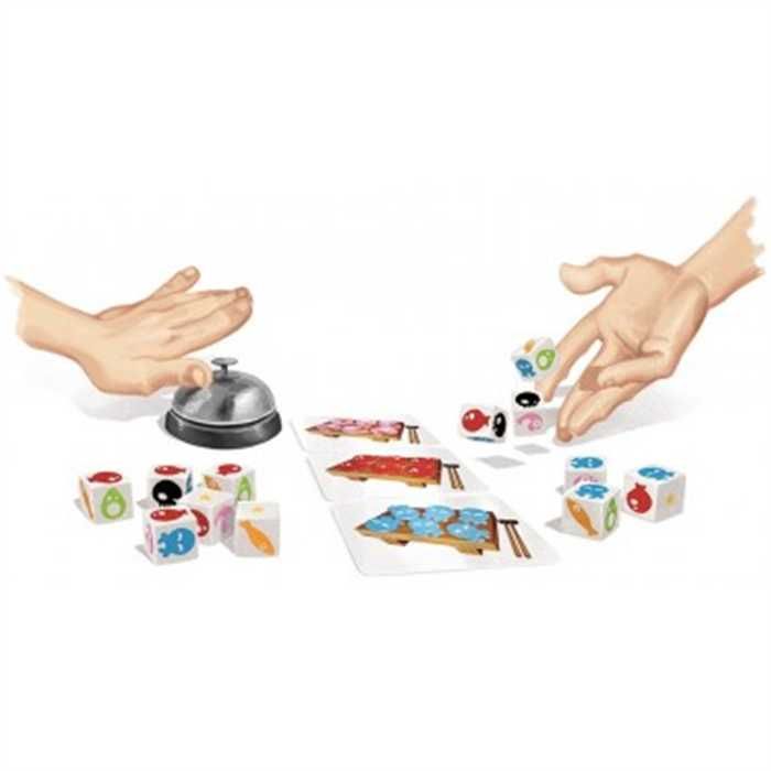 Des cartes "ingrédients" sont placées face visible au centre de la table. Au top départ, lancez simultanément les dés et réservez ceux qui présentent les dessins correspondant aux cartes qui sont sur la table. Ne cessez pas de jouer jusqu'à ce que vous obteniez la totalité des ingrédients présents sur une carte. Dans ce cas, enclanchez la sonnette et le duel s'arrête. Vour remportez la carte "plateau" correspondant.