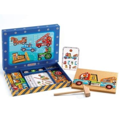 Comme papa dans son atelier, l'enfant fait résonner son marteau pour construire sa voiture. Il doit assembler toutes les pièces sur la plaque de liège et les fixer avec des petits clous. Pour que cela tienne bien, l'enfant doit avoir un geste précis pour taper sur le petit clou.