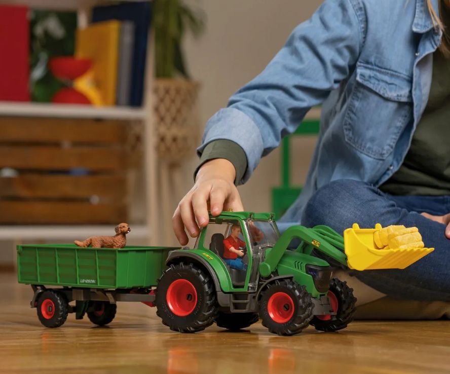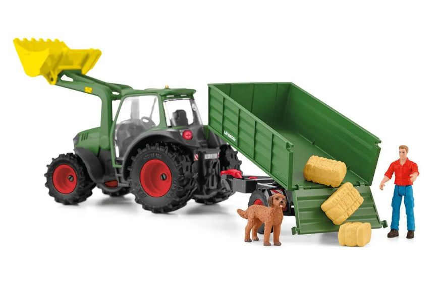 Contenu : 1 tracteur, 1 chargeur avant, 1 remorque, 1 fermier Paul, 1 Goldendoodle et 3 ballots de paille