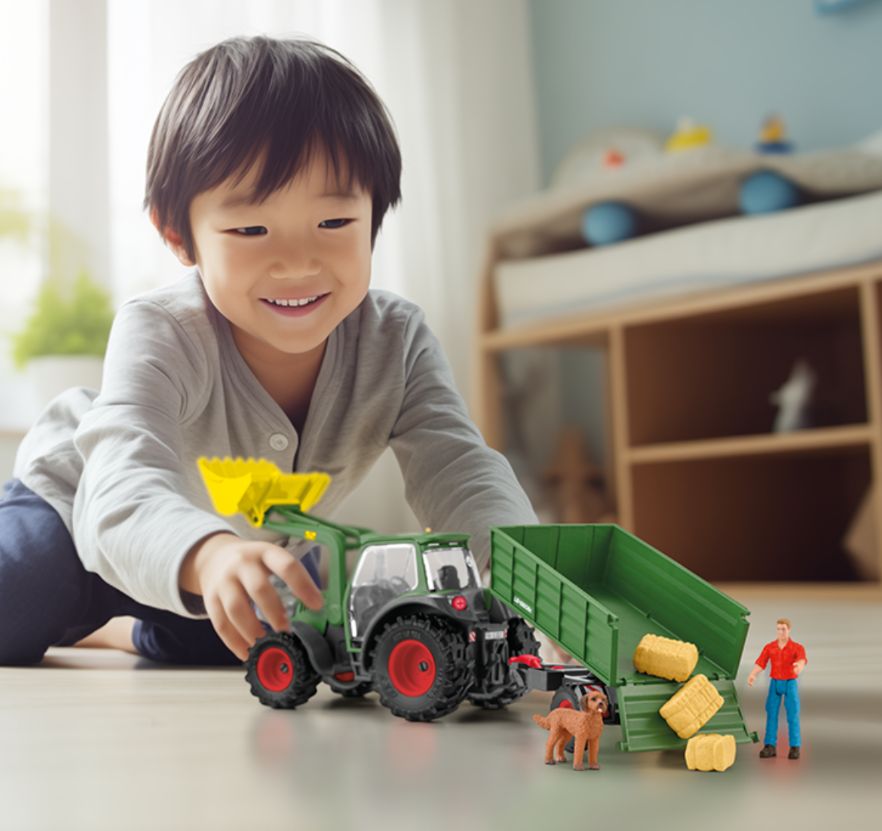 Le tracteur est la fierté de Paul le fermier. Sans lui, il aurait du mal à accomplir son travail. Sans effort, il vide les ballots de foin du godet du chargeur avant dans la remorque. Une fois à la ferme, il lui suffit d'ouvrir la trappe pour vider la remorque. Un jeu d'enfant ! En cas de problème avec le moteur, il ouvre le capot. La plupart du temps, il peut effectuer les réparations lui-même. Son fidèle Goldendoodle accompagne toujours Paul dans ses déplacements, ce qui leur évite tout ennui pendant ce travail difficile.