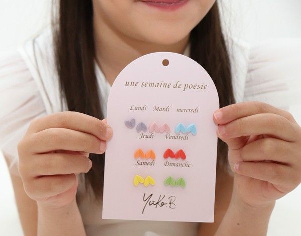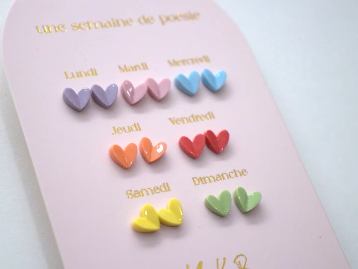 Une carte de 7 paires de boucles conçues spécialement pour les oreilles percées, chacune ornée d'un motif coeur unique. Cette gamme vous permettra de changer de style au gré de vos humeurs tout au long de la semaine et d'ajouter une dose de poésie à votre quotidien.