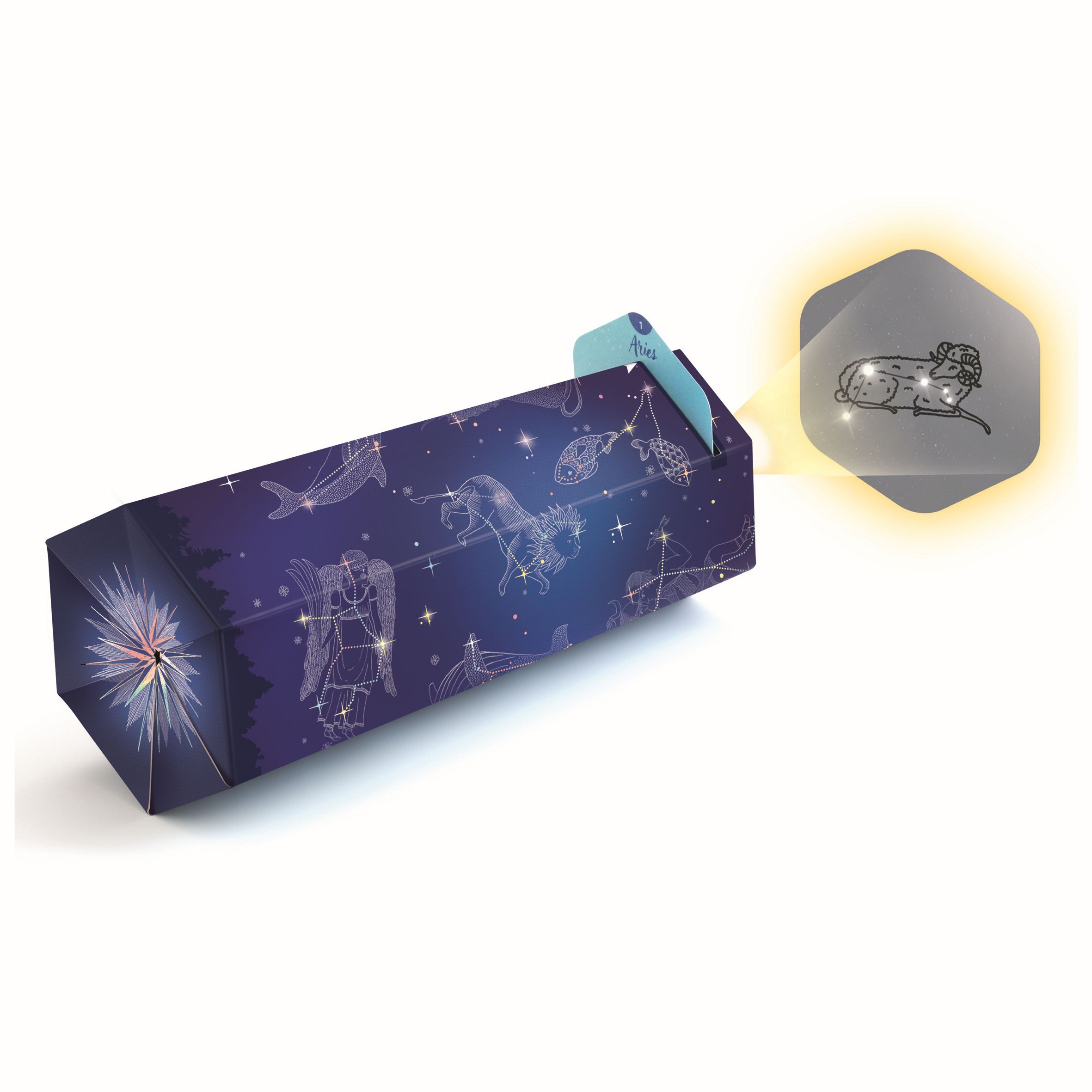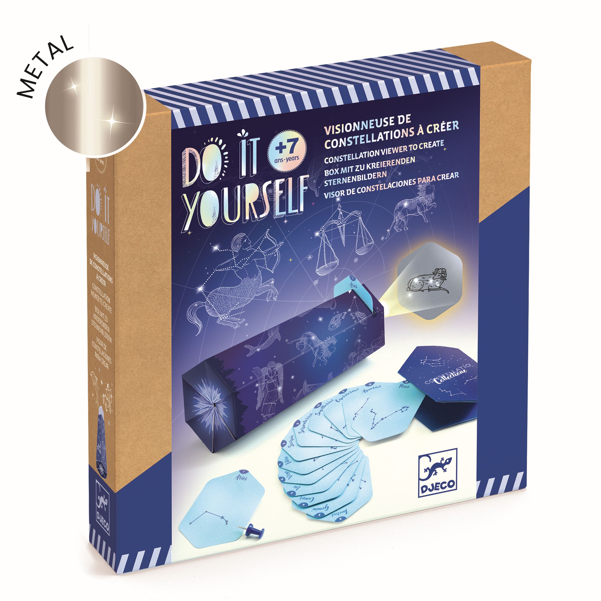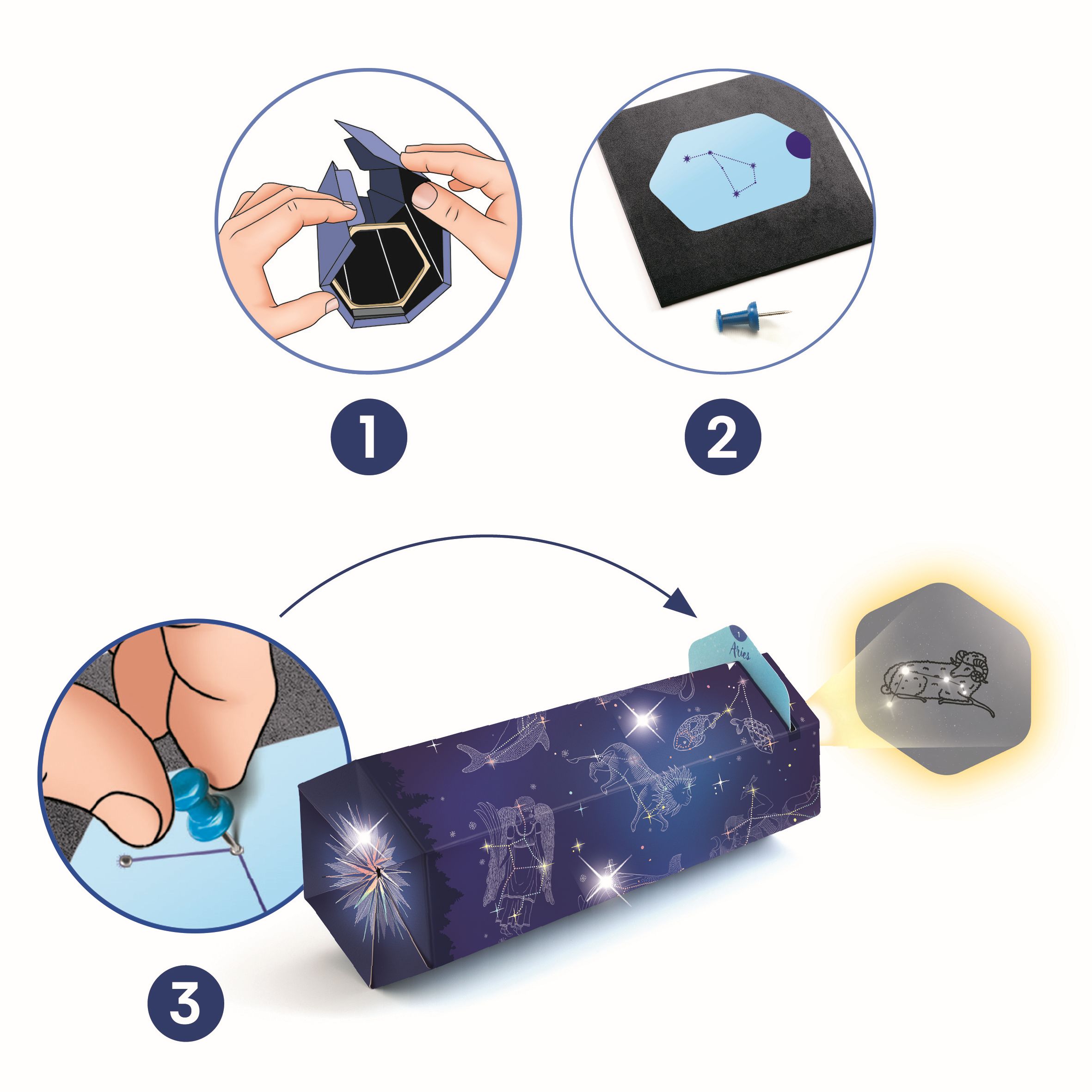 Contenu : 1 visionneuse à assembler, 1 anneau en bois, 4 planches de stickers, 26 cartes constellations à picoter et leur étui de rangement, 1 outil de picotage, 1 plateau de picotage, 1 livret des constellations et 1 feuillet de pas-à-pas détaillé